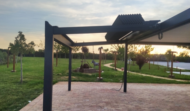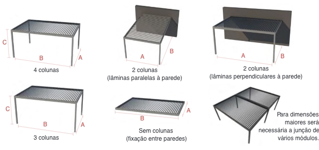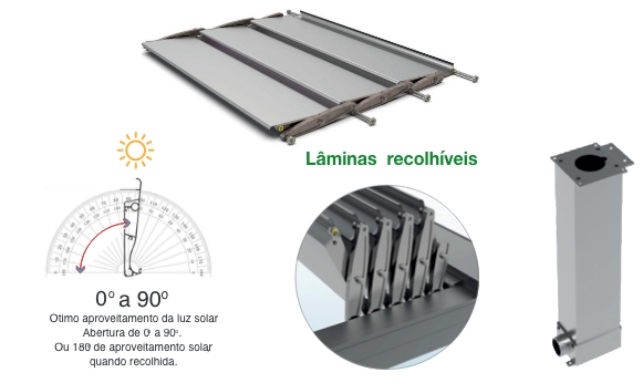 Sistema retrátil de sombreamento com lâminas de alumínio giratórias e retráteis ou fixas, manual ou motorizada, que lhes conferem um elevado valor estético. Possui um sistema hermético de drenagem de água da chuva. Suportam pressões de vento até 224km/h, 150L/m²/h de água de chuva. Ideal para utilização em espaços exteriores e semi-exteriores: áreas de lazer, edifícios, casas, hotéis, indústrias, restaurantes, cafés, etc.