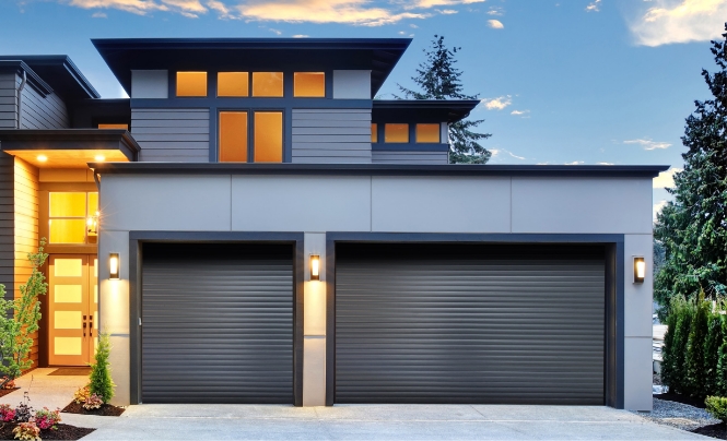 Um portão rolante de garagem que desliza verticalmente (paralelo ao teto) e não requer muito espaço. Bonito prático, versátil, resistente e seguro.