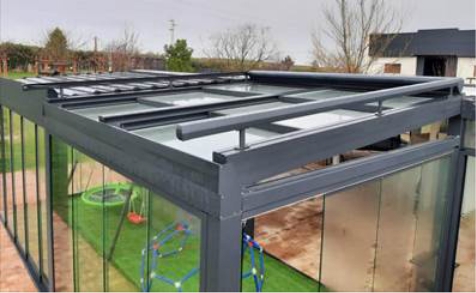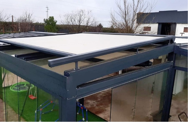 Sistema de toldo horizontal para teto, composto por um tecido especial, para coberturas em vidro fabricado com materiais altamente resistentes e versáteis, bloqueiam a radição solar reduzindo a entrada de calor para os espaços interiores. Extrutura em alumínio. Disponível para eixos Ø70, Ø78 e Ø85mm.Possui um sistema de cremalheira que tensiona o tecido evitando entrada de ventos que danifiquem a estrutura.