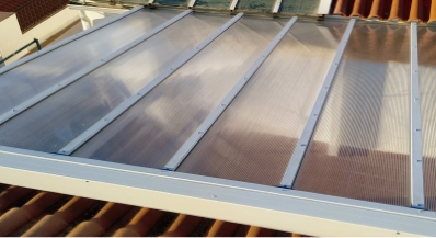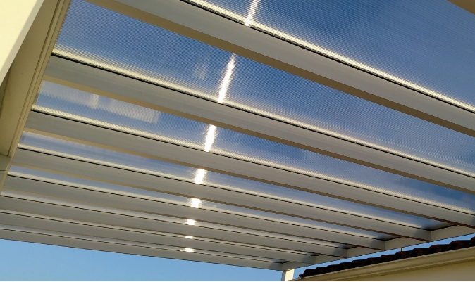 Sistema de telhado de vidro transparente que permite que você desfrute de uma vista panorâmica sem quaisquer obstáculos. O design moderno com acabamento onde nenhum parafuso é visível na moldura, apresenta vigas intermediárias extremamente estreitas e elegantes. Painéis fixos de vidro laminado 4+4/16, policarbonato (8 e 16mm) ou vidro fotovoltáico, discretamente inclinados para evacuar a água da chuva com drenagem através das duas colunas frontais. Ideal para uso em espaços externos: casas, instalações hoteleiras, restaurantes e cafés.